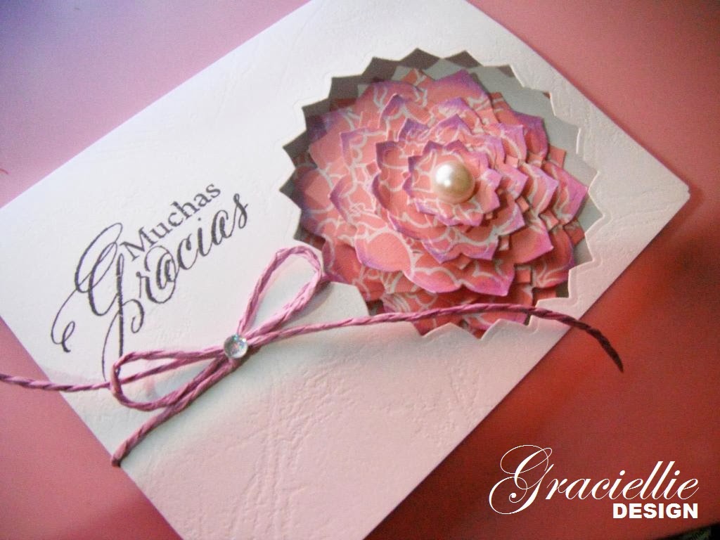 This is a window card actually. The contour of the flower is die cut on the card front. The card closes perfectly and when closed one would think the flower is adhered to the card front. I used the ribbon to not only embellish but also to create a stem for the flower. And because this is a CAS card, I finished it with a sentiment. This spanish sentiments say in English: "I Love You a Lot", "Lots of Thanks" and "Happy Anniversary".